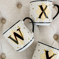 Vintage-inspired ceramic mug with gold foil detailing that features the letter W.
