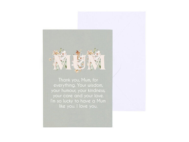 Front of card reads: 'MUM - Thank you, Mum, for everything. Your wisdom, your humour, your kindness, your care and your love. I'm so lucky to have a Mum like you. I love you.'