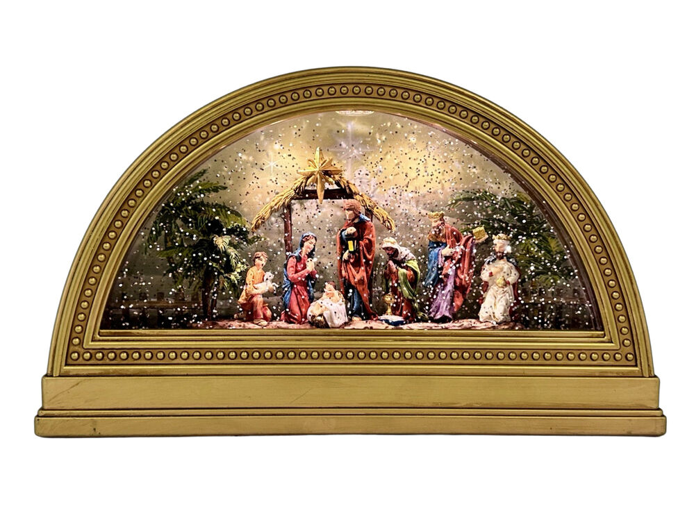 An LED set showcasing the nativity scene, filled with automatic swirling glitter in water. The figures of Mary, Joseph, baby Jesus, the Three Wise Men and a shepherd boy holding a lamb sit inside an arch-shaped base in a gold colour, with the colours of their clothing painted in beautiful detail. Trees and a manger archway are seen among them, with the golden Star of Bethlehem also present.