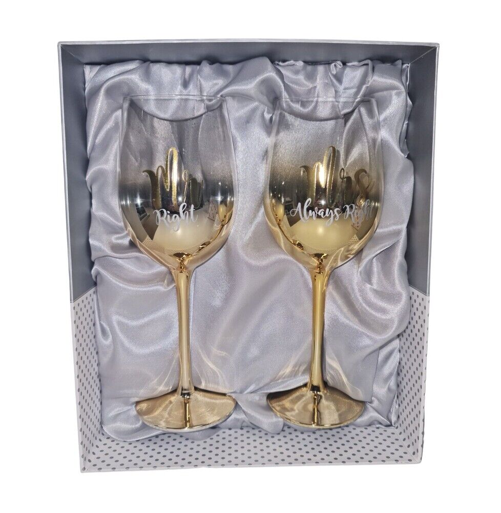 This beautiful Wine Glass Set features Rose Gold Ombre stems and script that reads "Mr Right" on one, and "Mrs Always Right" on the other.