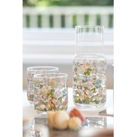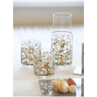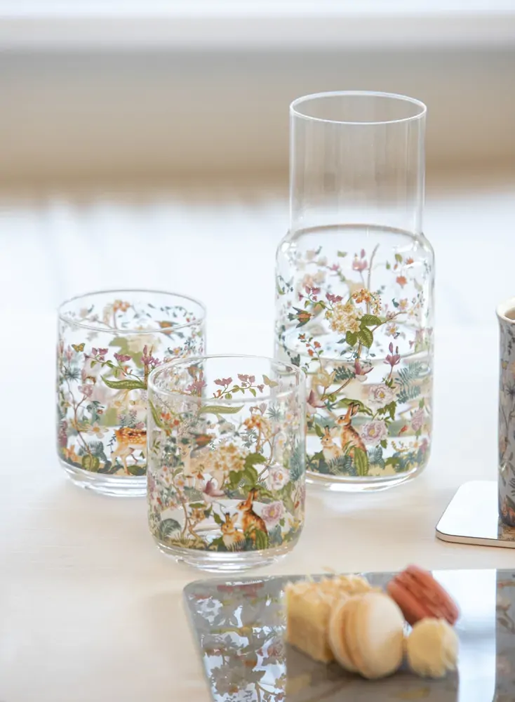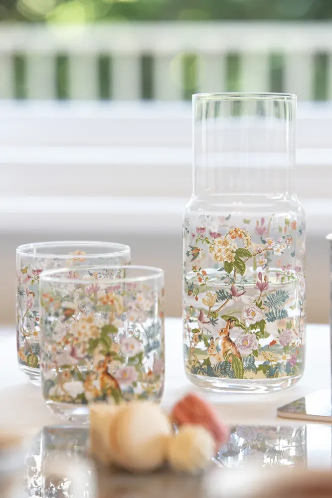 From Ashdene's Enchanted Forest range, a glass carafe & cup set featuring beautiful floral designs in soft colours and woodland animals including bunnies and fawns.