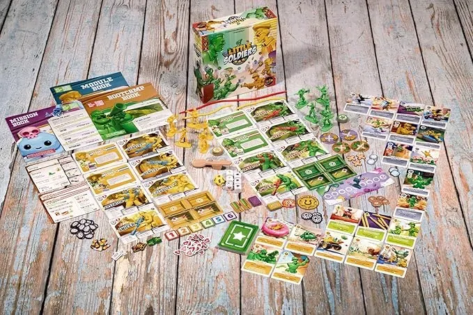 In Little Soldiers, two armies of plastic soldiers fight it out on the table, using the plates, glasses, and anything else that happens to be there for cover or as vantage points for action. Move your characters, attack your enemies, hide behind the butter dish, and use your cards for special actions.