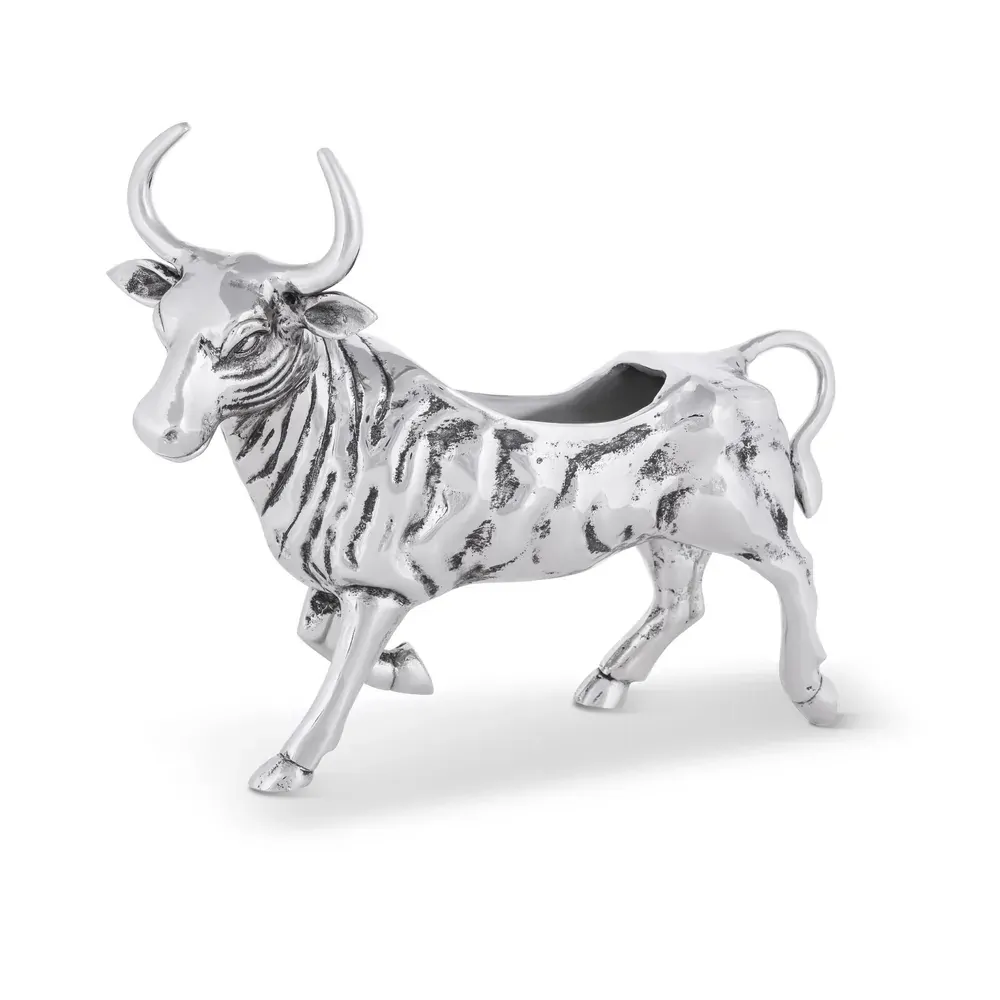 A bottle holder in the shape of a bull, with a silver textured finish.