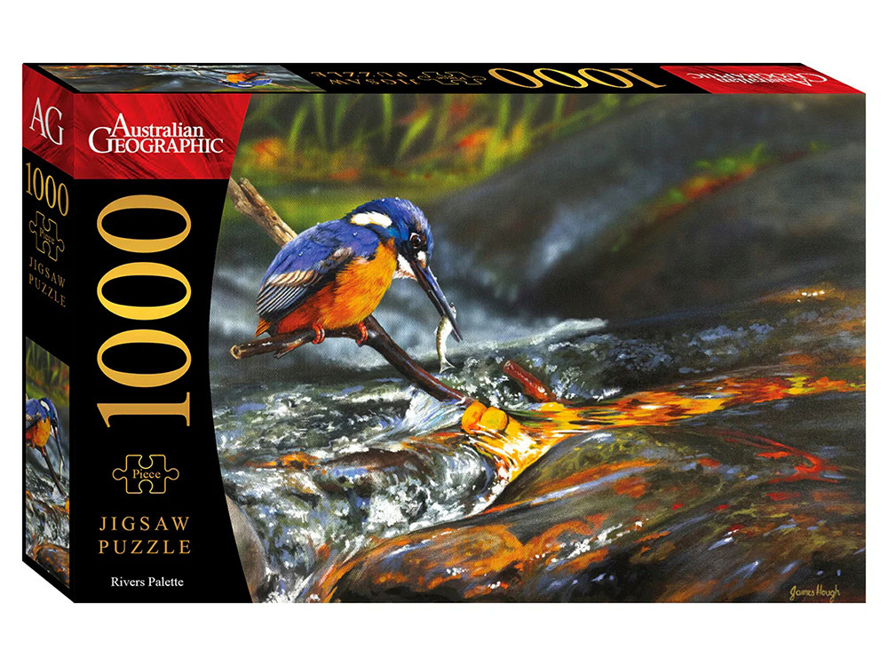 Discover the captivating world of Australian wildlife with the 1000-piece Australian Geographic puzzle, Rivers Palette. When complete, it shows an exquisite image of an Azure Kingfisher holding a tiny fish in his beak, plucked from the running waters of a stream. This is the kind of jigsaw puzzle that challenges you just enough, testing your skills and letting you revel in the incredible colours of nature used in the image.