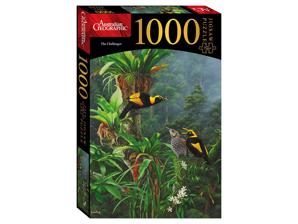 Discover the captivating world of Australian wildlife with the 1000-piece Australian Geographic puzzle, The Challenger. When complete, it shows a beautifully rendered image of 2 Regent Bowerbirds amongst a classic nature scene, in the middle of a stand off for the affections of a mate. This is the kind of jigsaw puzzle that challenges you just enough, testing your skills and letting you revel in the incredible colours of nature used in the image.