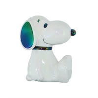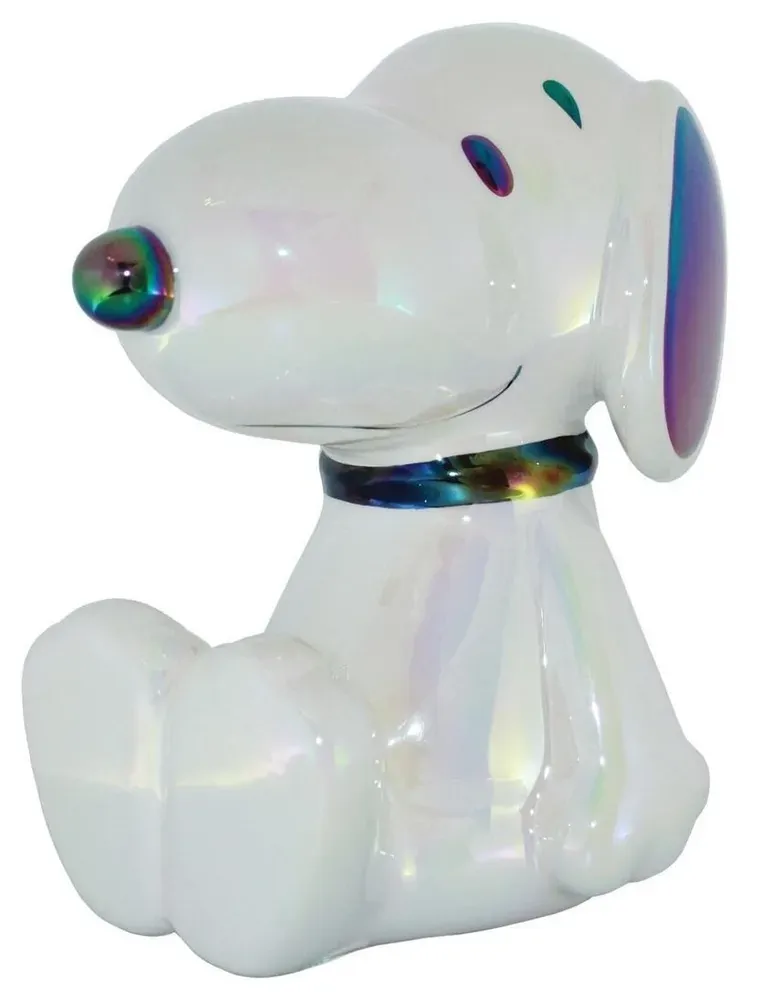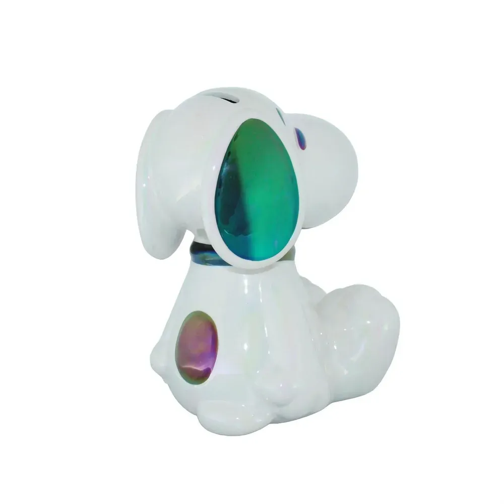 Snoopy, America's favourite beagle, is featured in this molded and hand painted ceramic money bank. A special electroplating process gives Snoopy a unique and very appealing iridescent shine.