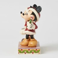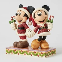 In this festive Jim Shore scene, Mickey and Minnie Mouse don Santa suits adorned with intricate rosemaling patterns and joyfully carry candy canes. Their bright smiles radiate holiday cheer, making the scene a delightful celebration of the season.
