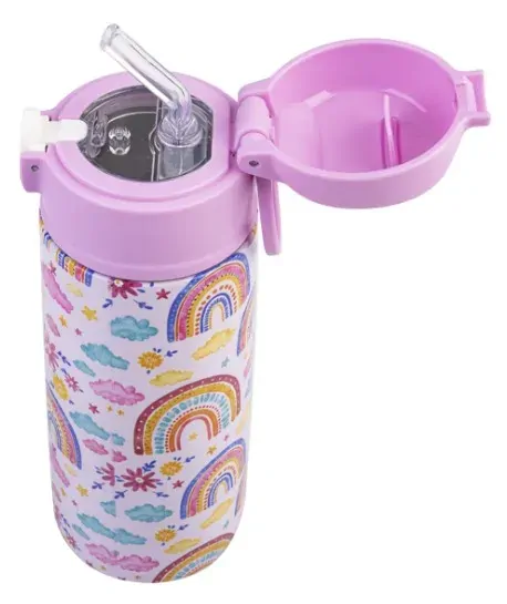 Designed for convenience, it comes with a flip-top lid and a removable silicone sipper straw, making sipping easy and cleaning a breeze. Built with double wall vacuum insulation technology, this bottle keeps drinks cold for up to 12 hours, ensuring refreshment throughout the day. Plus, the insulation prevents condensation, so no more soggy backpacks! Crafted from premium 18/8 stainless steel, its rust-resistant, odour-free, and incredibly durable - ready to handle anything kids throw at it.