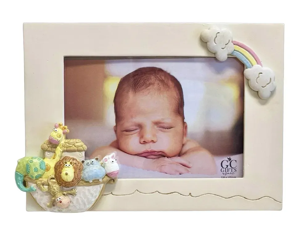 A lovely photo frame to display a picture of baby. In a soft cream shade, it features 3D motifs of Noah's Ark and a rainbow. Fits a 150 x 100mm photo.