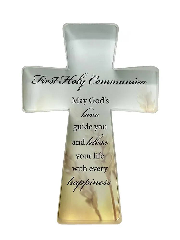 A beautiful glass cut standing cross featuring text that reads 'First Holy Communion - May God's love guide you and bless your life with every happiness'.