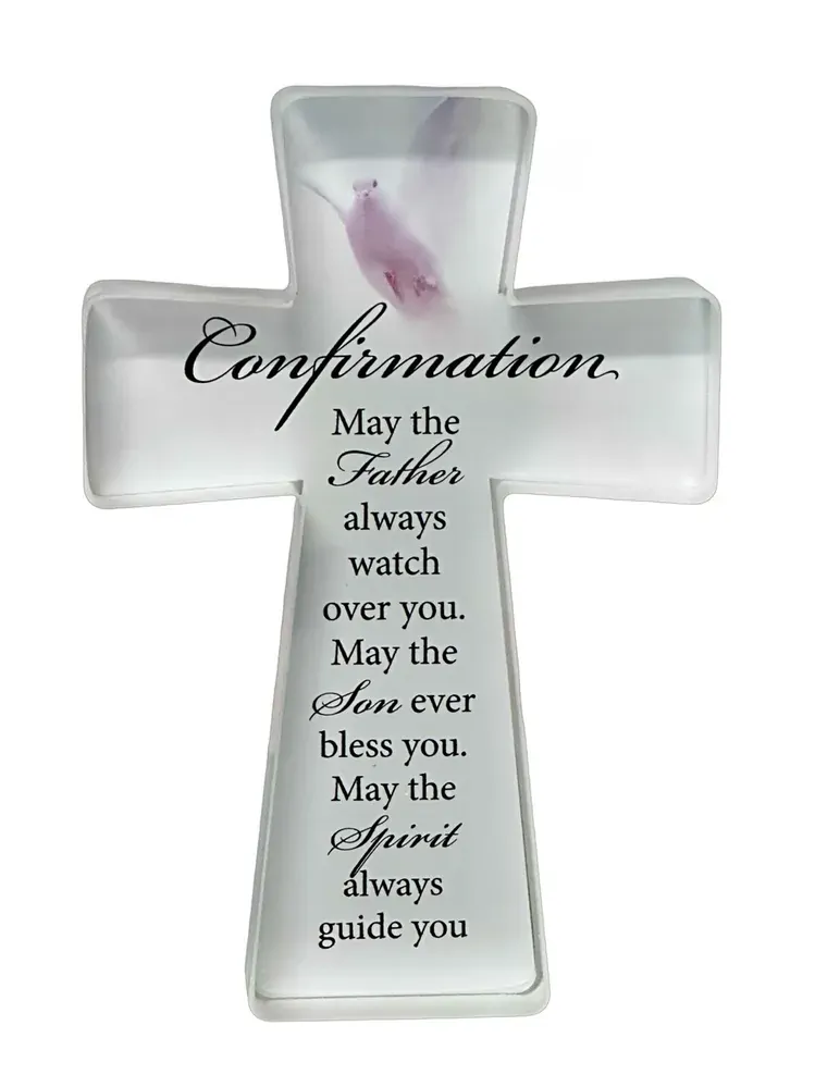 A beautiful glass cut standing cross featuring text that reads 'Confirmation - May the Father always watch over you. May the Son ever bless you. May the Spirit always guide you'.