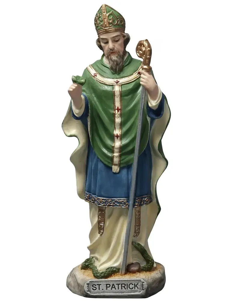 This statue depicts Saint Patrick. Text at the base reads: 'St. Patrick'.