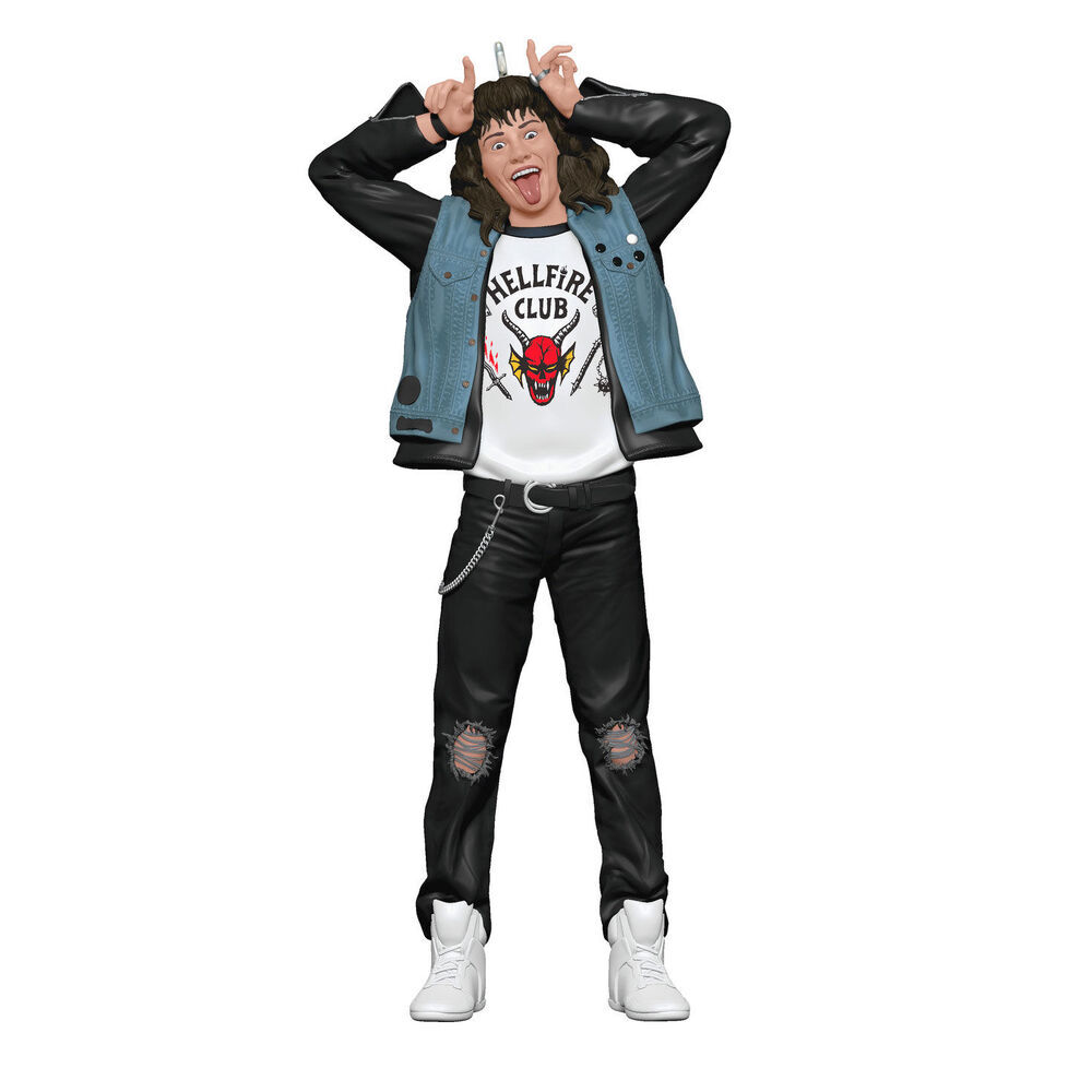 We think it's finally your year! Turn your frown upside down and celebrate the holidays with Eddie Munson, resident metalhead, 6th-year senior and leader of the Hawkins High School D&D club. This Stranger Things Christmas tree ornament features hoodlum-turned-hero Eddie making a face with horns and sporting a Hellfire Club T-shirt under his leather bomber jacket and denim vest.