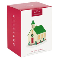 A beautiful representation of a heart full of faith, this Christmas tree ornament features a charming church with a red door and green roof and steeple surrounded by a dusting of glittery snow. Insert the bulb of a standard miniature light string through the rubber grommet on the ornament to create a special lighting effect.