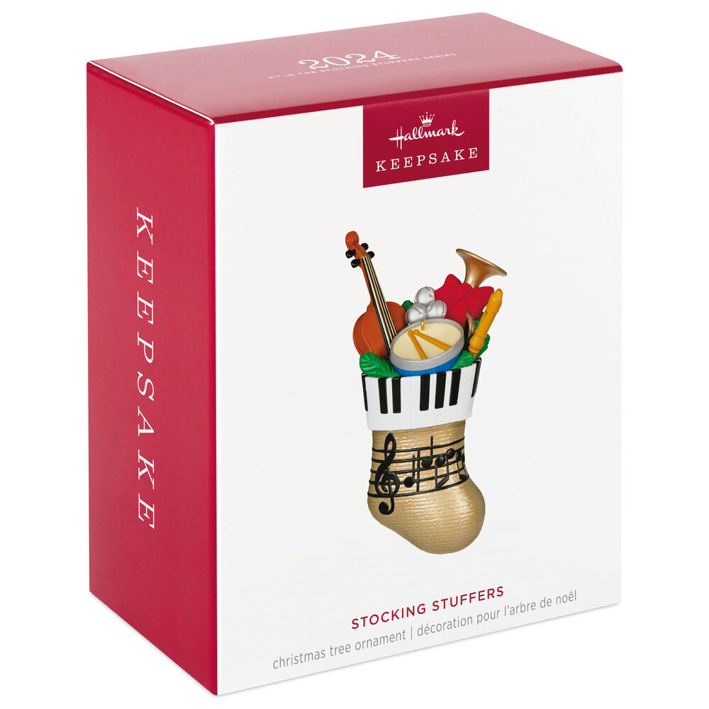 Hit all the high notes this holiday season with the newest Stocking Stuffers Christmas tree ornament. The festive gold stocking accented with music notes features a piano keys cuff. Instrument-themed stocking is filled with a violin, horn, recorder, drum and jingle bellsperfect for accompanying caroling friends and family. 4th in the Stocking Stuffers Keepsake Ornament series.