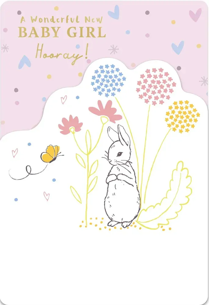 The front of the card features soft pastel colours in pink, blue, yellow and more, and a depiction of Peter Rabbit himself standing among flowers in classic Beatrix Potter style. The front has a cutout shape so you can open it to reveal the message inside. The inside of the card continues with the pastel theme and reads 'A wonderful new baby girl' 'Hooray!' 'Congratulations on your adorable new arrival'.