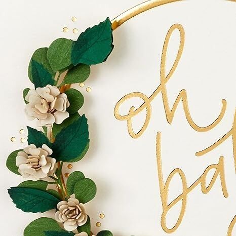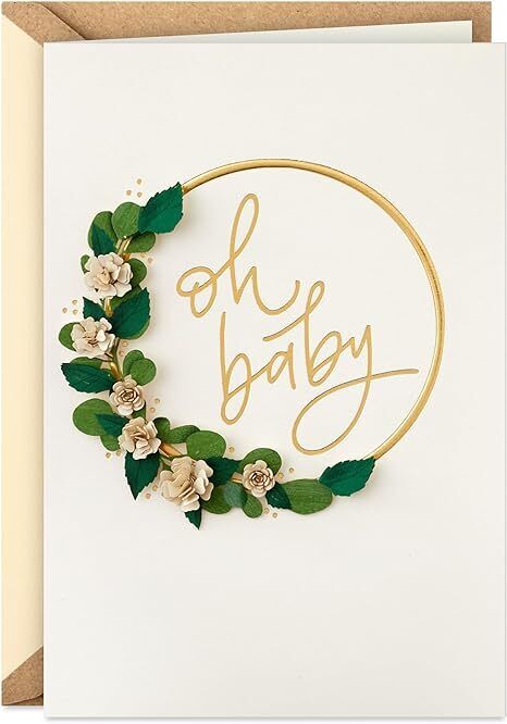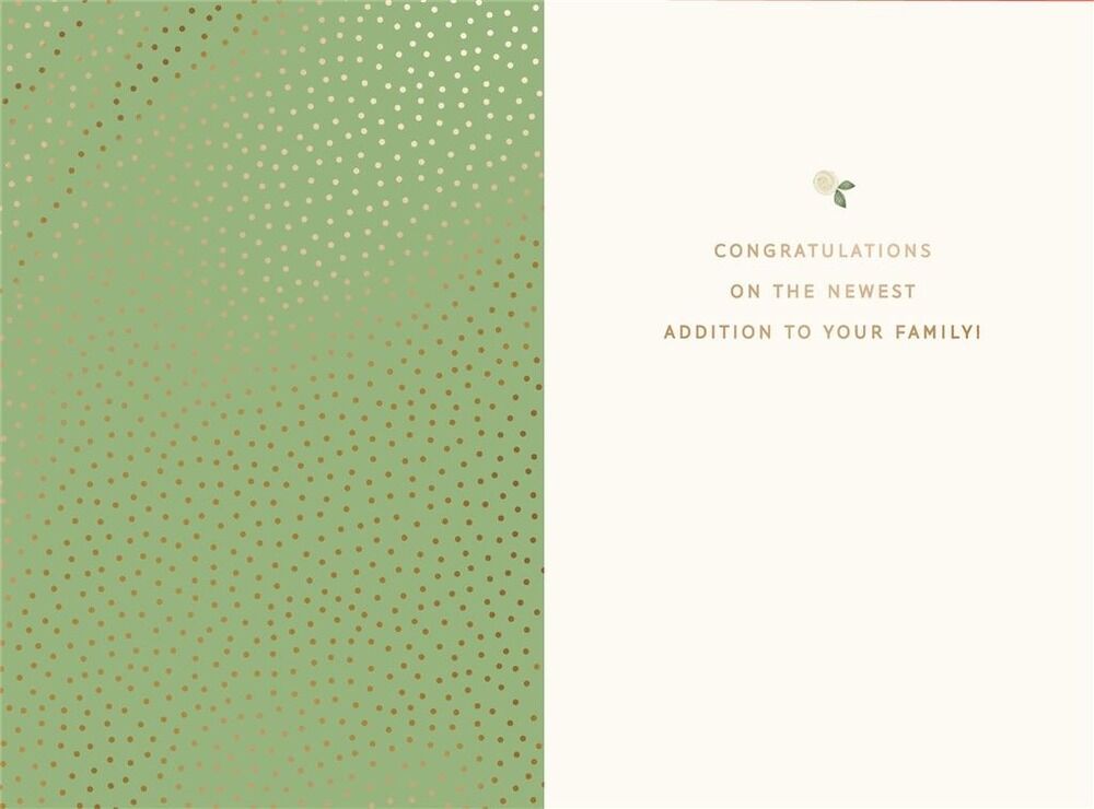 The front of the card features die-cut shaping of a gold wreath with 3D florals, bold gold foiling and script reading: “Oh baby". The inside of the card features the message: “Congratulations on the newest addition to your family!"