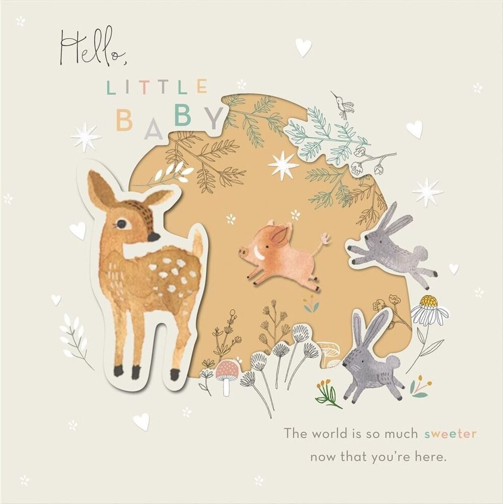 The front of the card features 3D die-cut shaping and motifs of nature and baby animals in soft colours, including a fawn and rabbits, with text reading: “Hello, little baby" "The world is so much sweeter now that you're here." The inside of the card features some more nature motifs and an image of a baby warthog that's visible through the die-cut opening on the front of the card, and the rest is left blank for your own message.