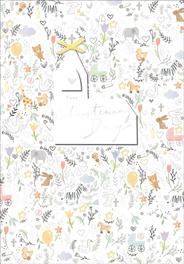 The front of the card features silver foiling, a motif of children's items, animals, a pastel yellow bow made of crepe paper attached as an accent, and a church outline with the message: “Your Christening Day". The inside of the card features some of the same motif around the message: “A special celebration, especially for you.”