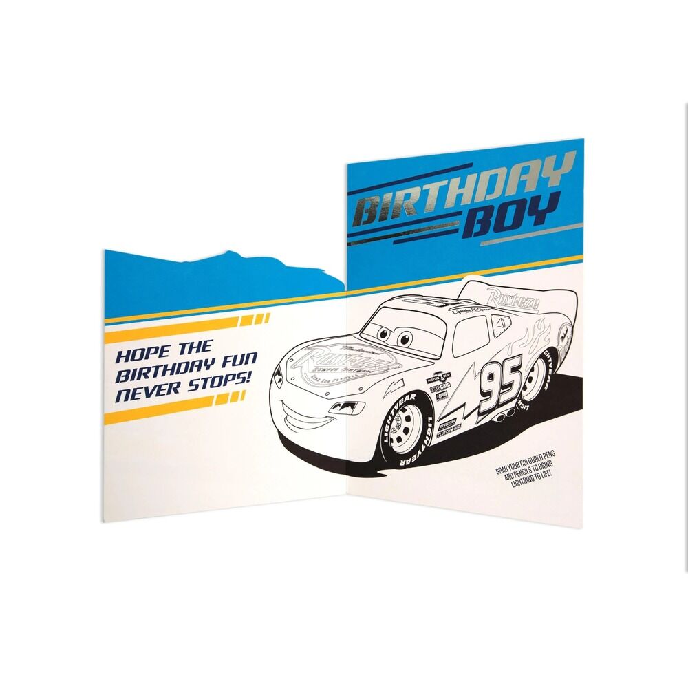 Send the birthday boy special wishes and a colouring-in activity on his special day with this fun birthday card from Hallmark's Disney Pixar Cars collection.