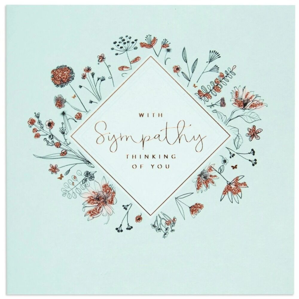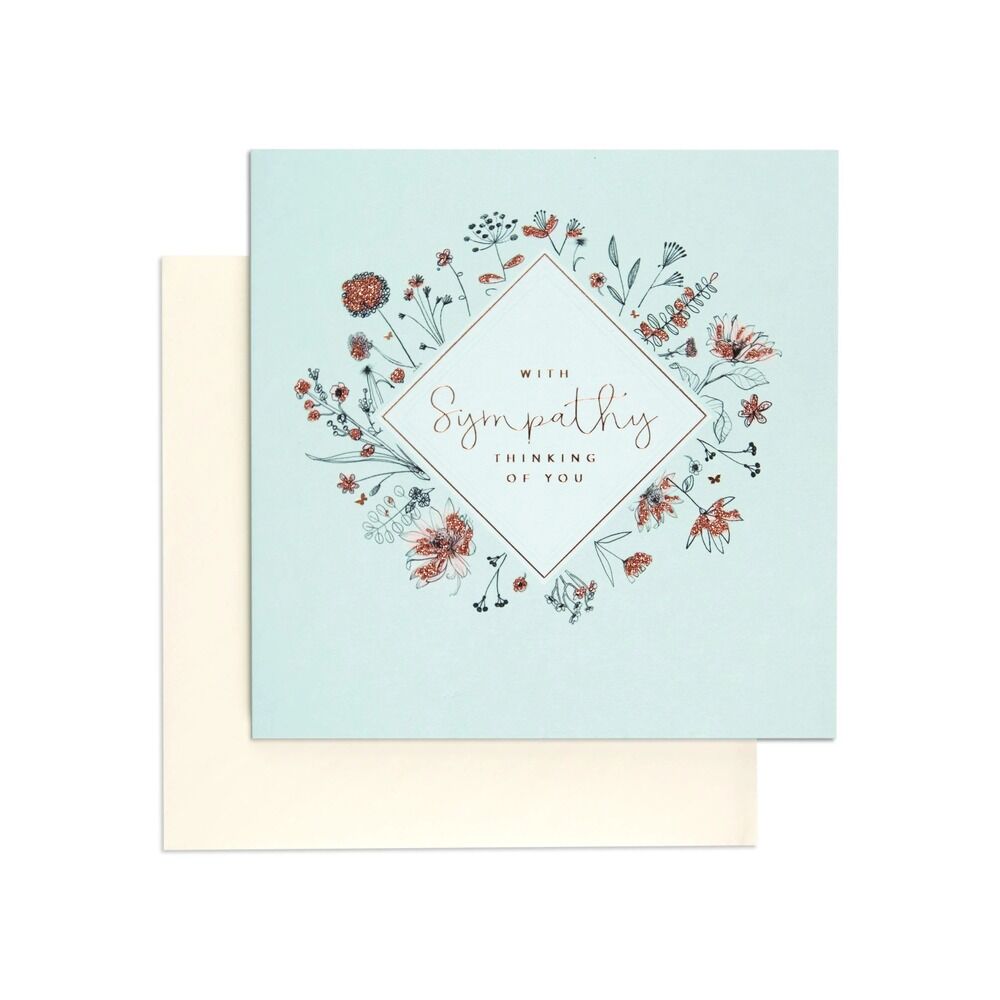 The front of the card features rose gold foiling, illustrations of delicate flowers around a diamond shape and a message that reads: “With sympathy" "Thanking of you". The inside of the card features more delicate flowers along the bottom edge with the message: “Caring thoughts are with you".