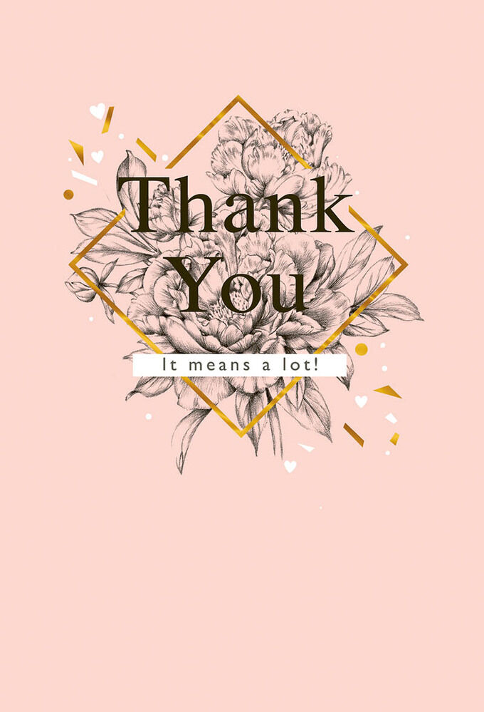 The front of the card features gold foiling, a floral motif within a diamond shape and the message: “Thank you” "It means a lot!" The inside of the card features scattered white hearts around the message: “With warmest wishes and a thousand thanks.”