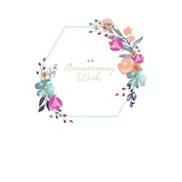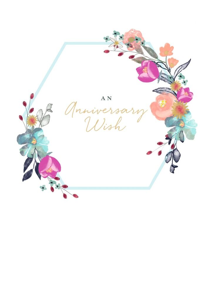 The front of the card features embossed detailing, gold foiling, a hexagonal wreath with brightly coloured florals and the message: “An Anniversary wish". The inside of the card features matching florals on the left hand bottom corner, and on the right is the message: “Sending you love on your special day".
