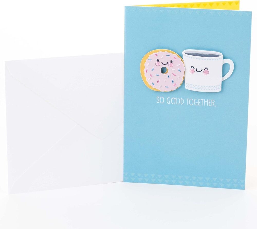 The front of the card features 3D die-cut shapes of an illustration of a smiling donut and coffee pair, including thread detailing, with text below that reads: “So good together." The inside of the card features the simple message “Happy Anniversary" so you can add your own sentiment beneath it.