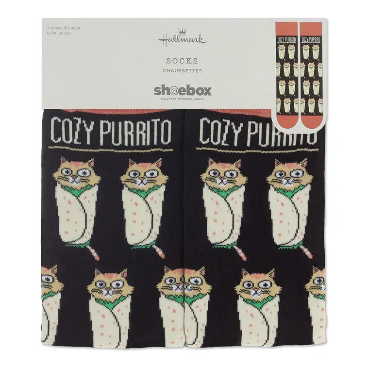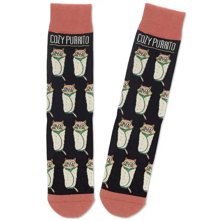 Wrap up your tootsies in these perfectly adorable socks from Shoebox and let everyone know you're a little extra. Black socks with coral-colored cuff, heel and toe accents feature designs of cats wrapped up in burritos paired with a punny message. Novelty crew socks fit most adult-sized feet and make a great just-because gift for cat lovers.