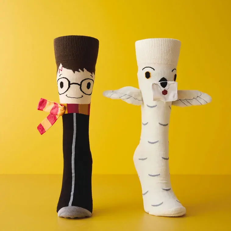 Show off your Harry Potter style with this set of footwear you won't want to hide under your pant legs! Our Harry Potter novelty socks feature coordinating designs: Harry Potter in his Hogwarts robe with a Gryffindor striped scarf attachment, and Hedwig with feather accents, outstretched wings and a fabric letter attached to her beak. This unique pair of non-matching socks makes a great gift for Harry Potter and Hedwig fans.