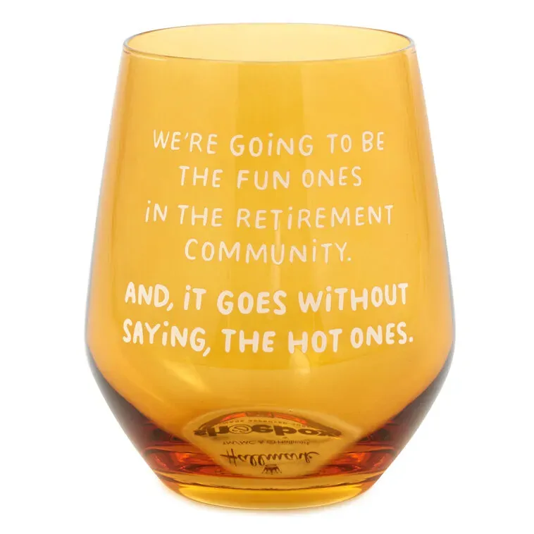 Age gracefully, like the demure and mindful women you and your bestie are, with this funny wine glass from Hallmark Shoebox holding your drink. This amber-tinted stemless glass features a hilarious foretelling of your future state - ruling the old school. Pair it with other funny stemless wine glasses, rocks glasses and coasters for barware that's outfitted to handle all the requirements of your friends and family with a shot of humour.