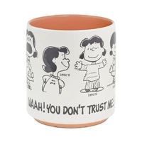 Start your day with a snicker when you sip your morning coffee from this cute Peanuts mug. Delightful pencil sketches of Charlie Brown's favorite foil, Lucy, throughout the years adorn this white ceramic mug with lavender handle and coral interior. 75th anniversary mug makes a great birthday, Mother's Day or holiday gift for a Peanuts fan.