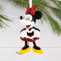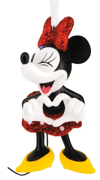 Delight Disney fans of all ages with this Christmas tree ornament featuring a classic design of Disney Minnie Mouse. Dressed in a sparkly red skirt and hair bow, the adorable Disney gal shares a loving wink as she holds her hands in a heart shape.
