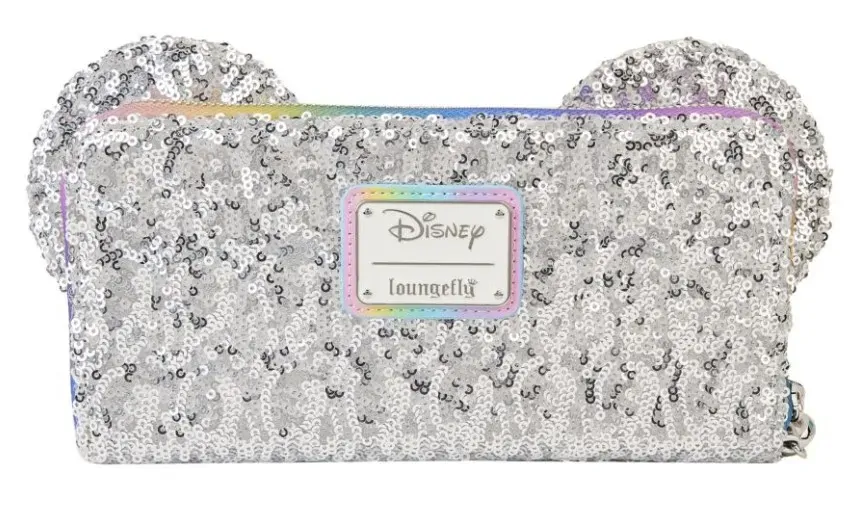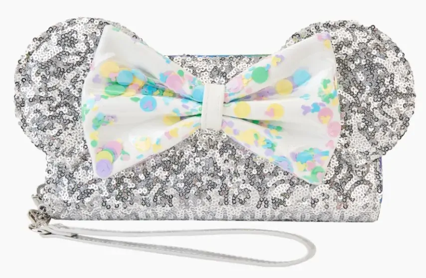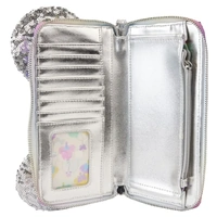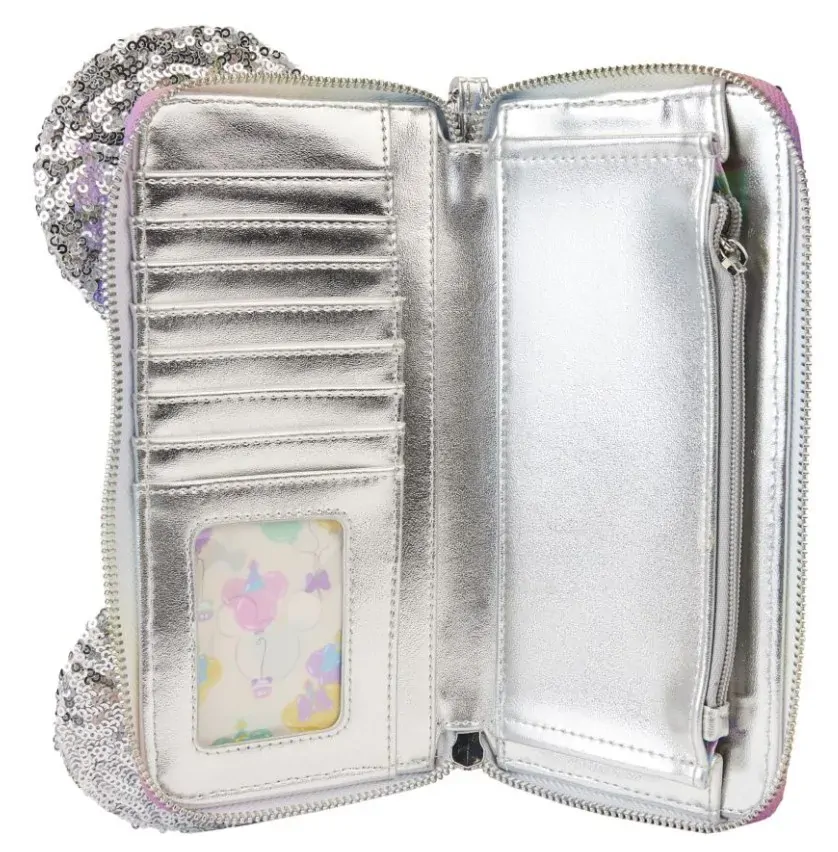 It's a piece of cake to pull off a festive look with our Loungefly Disney Mickey Mouse and Friends Birthday Celebration Zip-Around Wallet. The 3D PVC bow holds colourful confetti sequins, and if you look carefully, you might spot some "hidden Mickeys." The entire wallet is covered in shiny silver sequins, including the signature ears that stick up on top. Inside, there are 8 slots for holding cards and 1 clear slot for displaying your ID. A die-cut shape of a Mickey Mouse balloon adds a celebratory touch. Sparkle and shine wherever you go with this charming accessory.