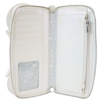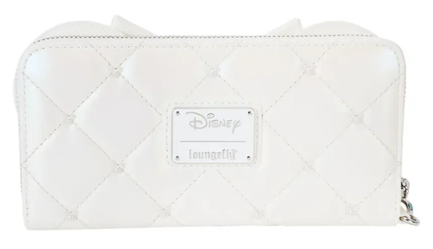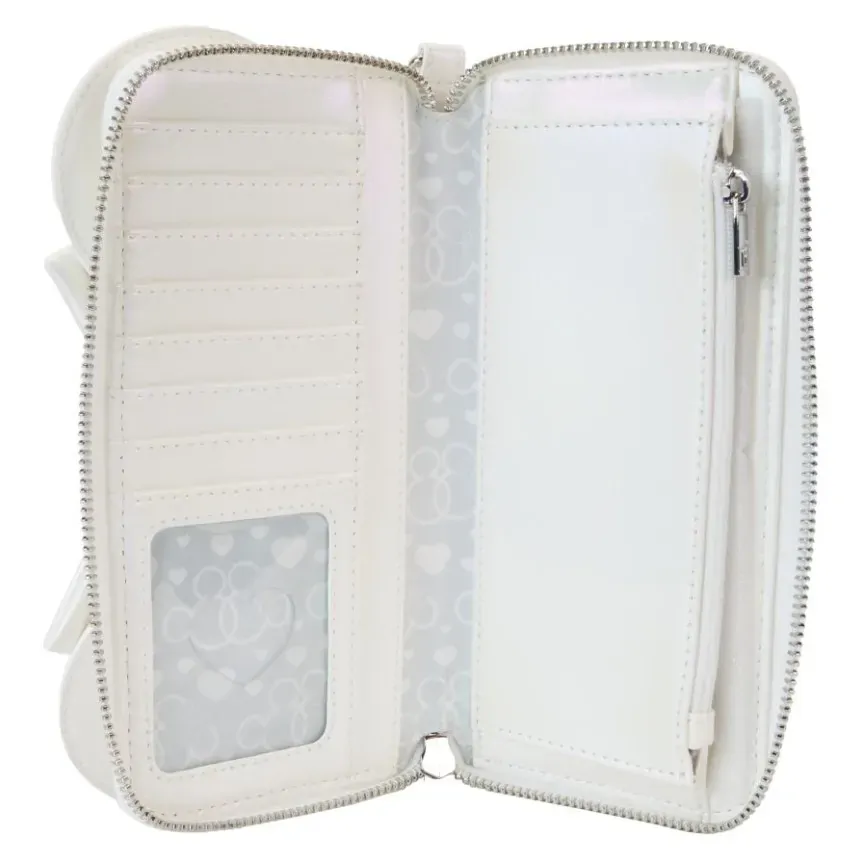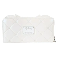 The Loungefly Disney Iridescent Wedding Wristlet Wallet is made of vegan leather (polyurethane). Wallet zips closed with shiny silver-coloured metal hardware, and the wristlet strap is detachable. Additional features include applique, quilted, 3D bow, molded pearl, and printed details. Take note of the coordinating inside lining.