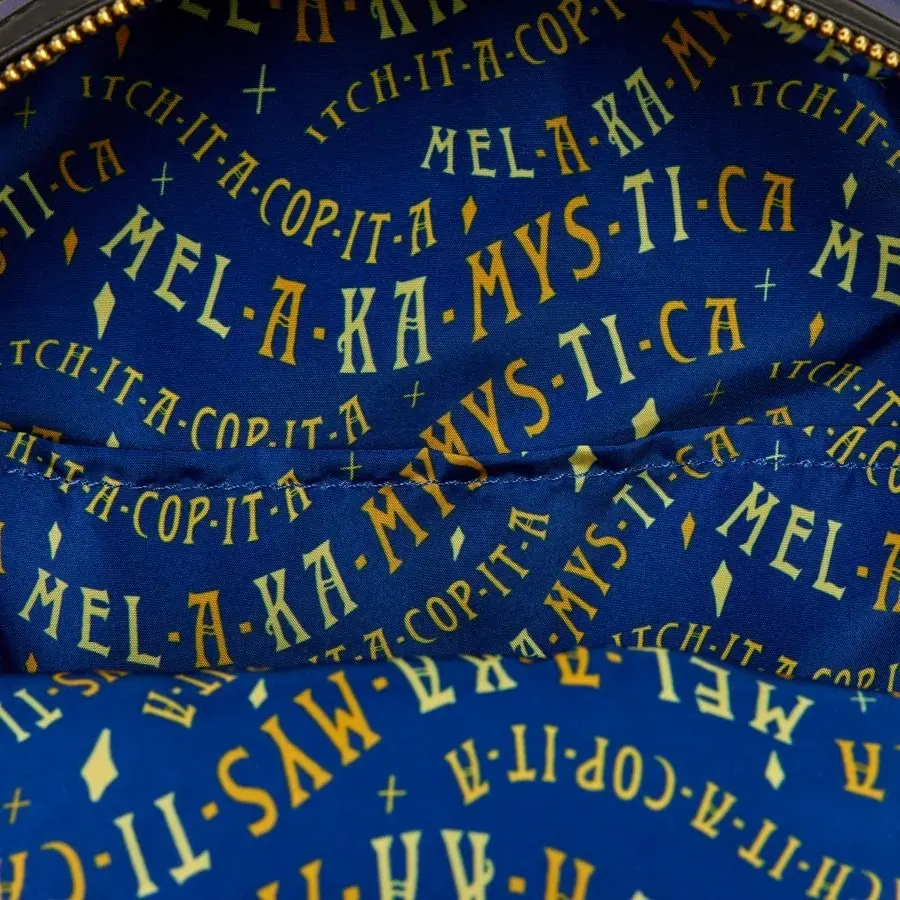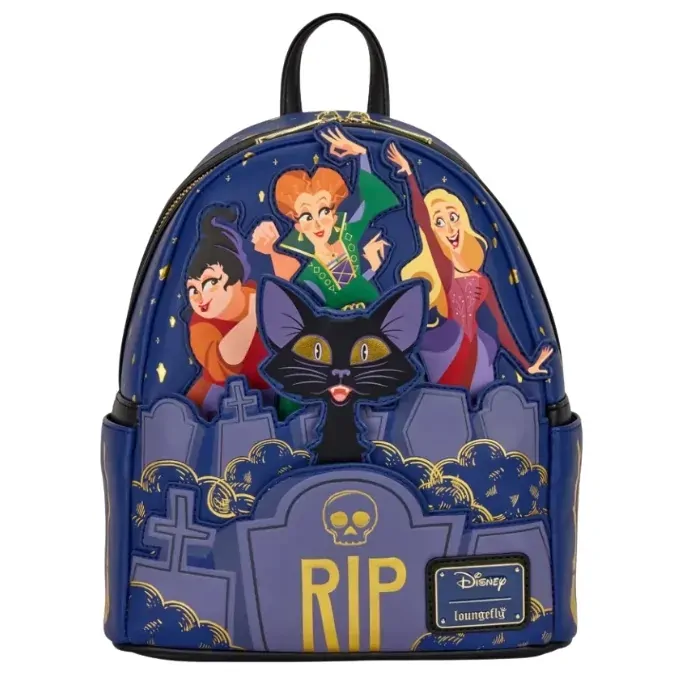 It's time to get witchy! This mini backpack features the Sanderson sisters from Disney's Hocus Pocus. They dance together under a starry sky in a graveyard. Binx pops up from behind a headstone! On the side pockets, you'll find gold foil details of each of their brooms.