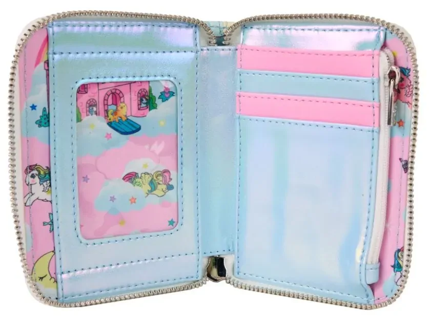 Spark some extra joy whenever you take this wallet out of your bag! This wallet features some of your favorite My Little Pony characters hanging out together on fluffy white clouds with sparkling rainbows and a smiling sun! Open it up to find four iridescent-and-pink card slots and one clear slot for an ID. The wallet zips closed to keep everything secure. Have some fun with your accessory game!