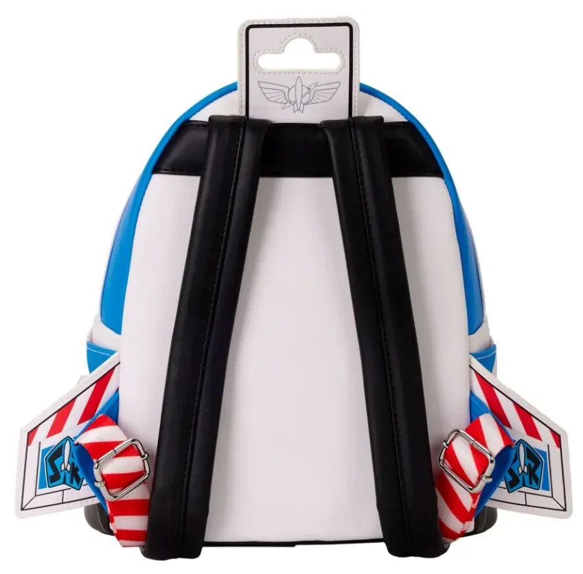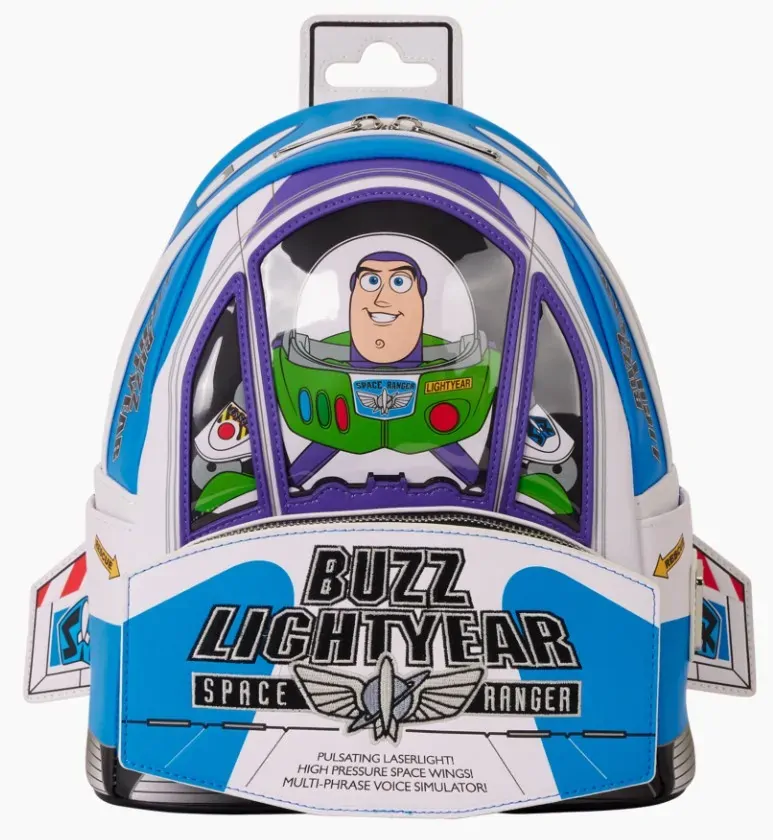 "To infinity and beyond!"This mini backpack is the perfect way to celebrate 30 years of Disney's Toy Story. This bag is in the shape of the Buzz Lightyear packaging you see in the film; it looks like his spaceship with wings sticking out from the side and clear PVC on the front through which you can see Buzz Lightyear. To make it extra special, this bag plays sound and glows in the dark! It's ready to take off on a new adventure with you!
