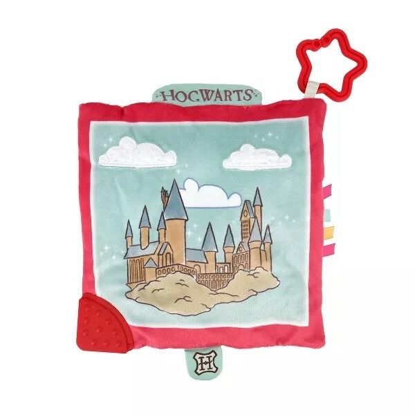 The Harry Potter On-the-go activity square features an illustration of Harry Potter and Draco Malfoy playing Quidditch on the front and Hogwarts castle at the back. The activity toy has a star shaped on-the-go clip and teether on the corner. With tabs, crinkle, rattle and squeaker, this activity toy will be enjoyed by little ones.