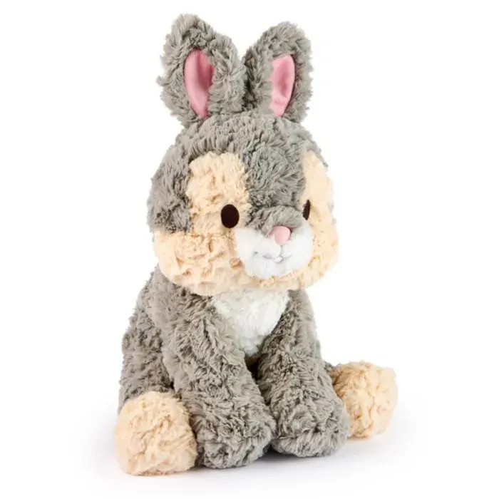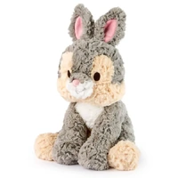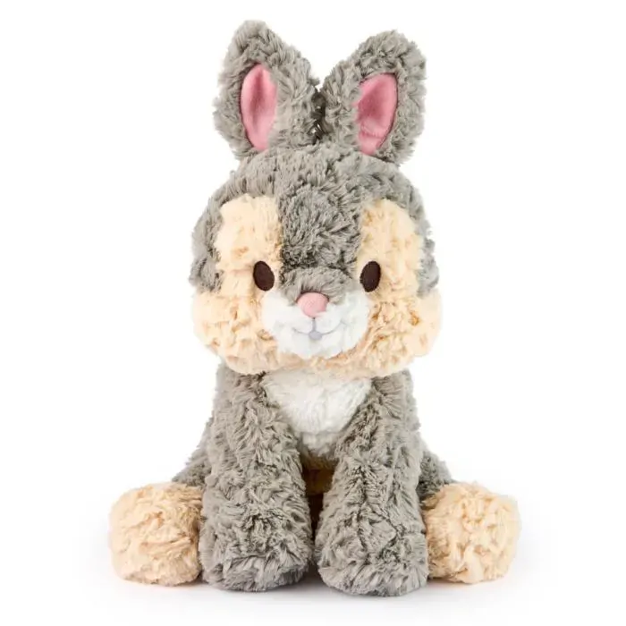 - Thumper has soft grey and cream plush, long ears, and a faux suede nose