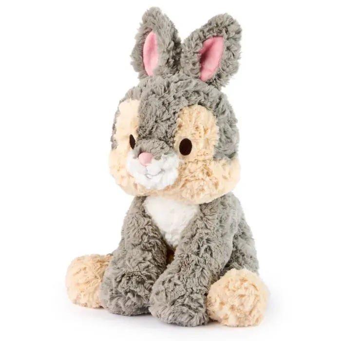 Thumper is here from the forest to play! This cuddly stuffed animal has been crafted in GUND's signature Cozys Collection style. Cozys are cuddly companions made from soft, textured fabrics that feel as familiar as hugging an old friend! This irresistibly cute Thumper plush features the iconic bunny rabbit with light grey plush and white accents. Thumper has long, grey upturned ears with soft pink plush lining, and his embroidered facial expression includes a cute smile and a soft pink faux-suede nose. Thumper also boasts a fluffy white puffball tail and cream-coloured back paws that match his face. Like all Cozys animals, this bunny has soft swirls of high-pile plush and floppy limbs built for hugging.
