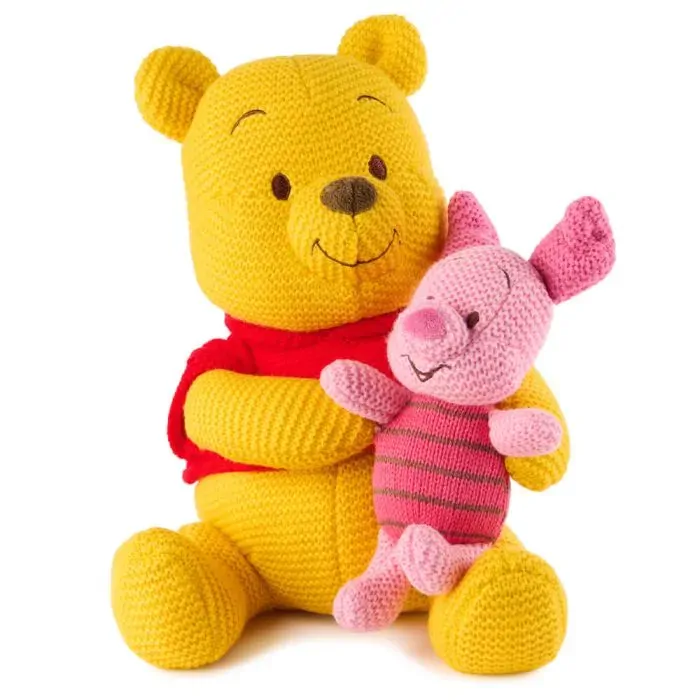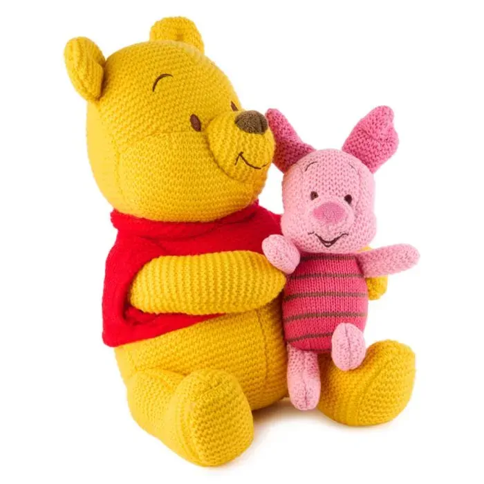 Celebrate friendship with Winnie the Pooh and Piglet! Even when things get a little scary, timid Piglet knows his best friend is always waiting nearby to make things better with a hug. This adorable seated plush features Pooh bear holding his pal Piglet in his lap like they’re ready for story time. Pooh and Piglet feature authentic character details from Winnie the Pooh, including Pooh’s red t-shirt, Piglet’s bright pink striped shirt, and their irresistibly cute smiles. This plush is also crafted with an eye-catching chunky knit design that adds a sophisticated touch to any collection, making it not only a cuddly companion but also a thoughtful gift and an impressive keepsake for any reader or kid at heart.
