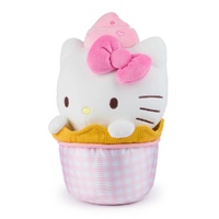Hello Kitty is extra sweet and dressed up as a tasty ice cream sundae! This large, huggable 10-inch plush features the kawaii little girl from the world of Sanrio comfortably nestled in a satiny pink plaid gingham-pattern waffle cup, with her paws resting on the edge. She has soft white plush, a pastel yellow nose, and chocolate-brown embroidered eyes and whiskers. Just behind her iconic pink bow, Hello Kitty also has a delicious swirl of strawberry ice cream on her head, accented by pink heart sprinkles.