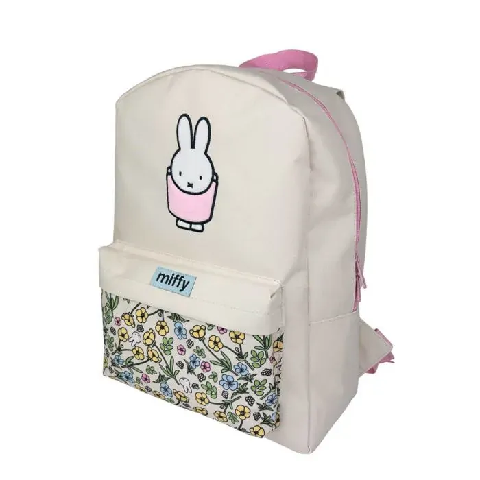 This pastel-toned Miffy backpack is both functional and fashion-forward. Featuring a minimalist cream upper, a floral front pocket, and a stitched Miffy patch, this piece blends the character’s iconic design with current trends in soft, nostalgic aesthetics. The Buttercup palette brings a calm, playful look perfect for school, work, or day trips.