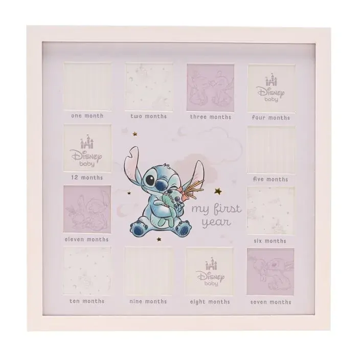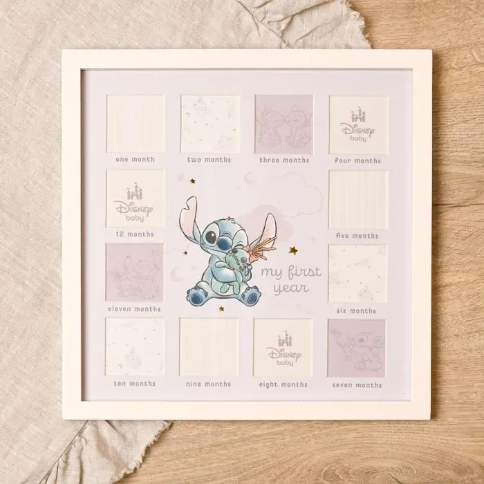 Capture those precious moments of your baby's first year with the Stitch Baby First Year Frame, a charming keepsake that's sure to delight Disney fans of all ages. This enchanting frame showcases the beloved character Stitch amidst colourful milestones and measurements, making it a fun and unique way to chart your little one's growth month by month. Each section of the frame allows you to insert a photo, creating a beautiful timeline of your baby's development.