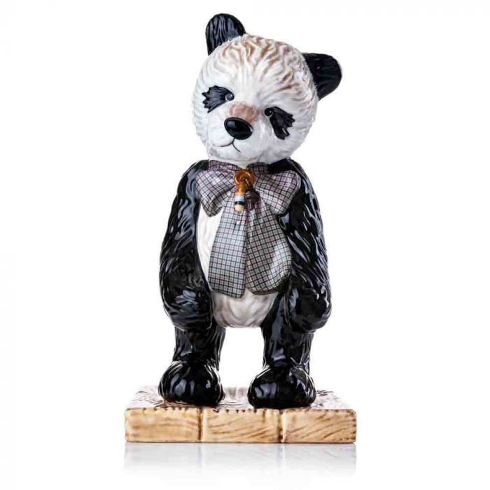 The English Ladies Co. has created a wonderful, ceramic interpretation of an Isabelle Collection piece, Mr Widget. This handsome panda is modelled in fine bone china and delicately hand painted. Mr Widget stands on wooden floorboards in an adorably melancholy position. His black & white fur texture has been carefully re-imagined, wearing an oversized checkered bow and rattle around his neck.