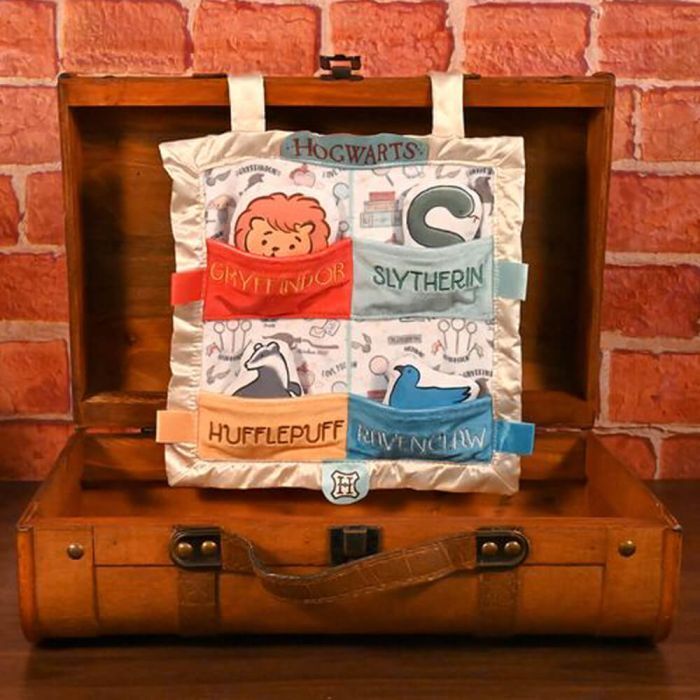 The Harry Potter on-the-go activity blanky features the Hogwarts Houses including Gryffindor, Slytherin, Hufflepuff and Ravenclaw. The activity blanket features a satin trim, multiple textures, peek-a-boo pockets, crinkle sounds, and velcro straps for on the go fun!