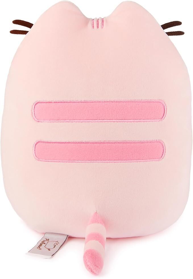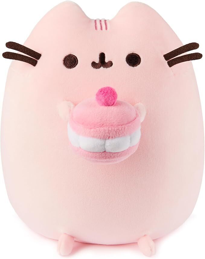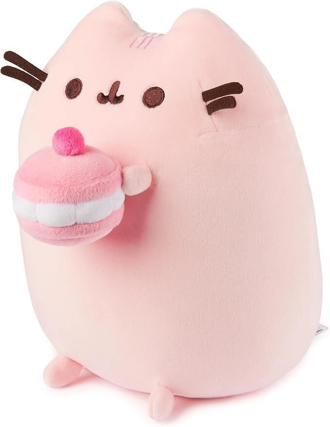 Join Pusheen for a sophisticated snack! This adorable, super-squishy plush features Pusheen holding a pink-and-white cherry macaron. Her pastel pink plush is accented by deep brown whiskers, matching facial embroidery, and pink stripes on her back and tail. Squisheens are super-soft, squishy, and surface washable for easy cleaning.