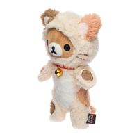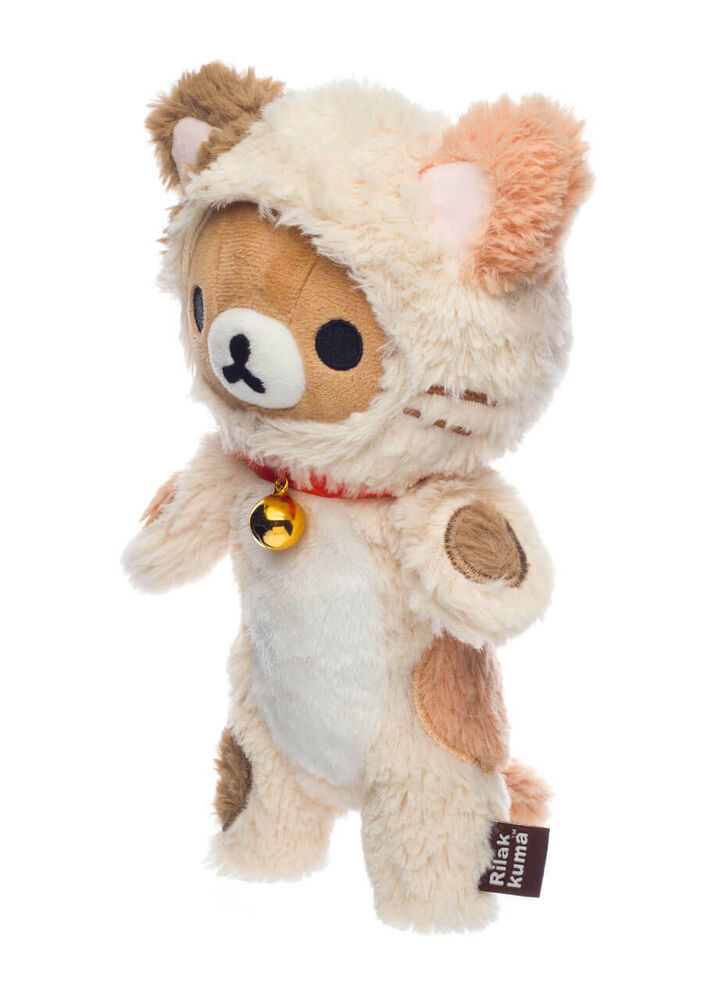 Rilakkuma is dressed as an cream & brown cat with long pile fur and a real bell on their collar. The 23cm plush is made of high quality material and features embroidered detailing.