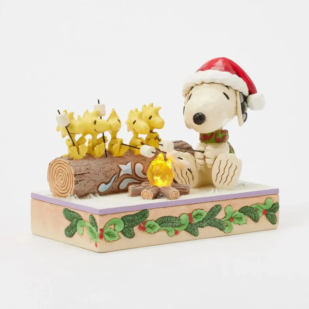 Warm up your holiday decor with this charming Jim Shore design of Snoopy and Woodstocks roasting marshmallows over a cozy LED flickering fire. Snoopy wears a Santa has as he shares a joyful smile and sweet treats with his feathered friends.